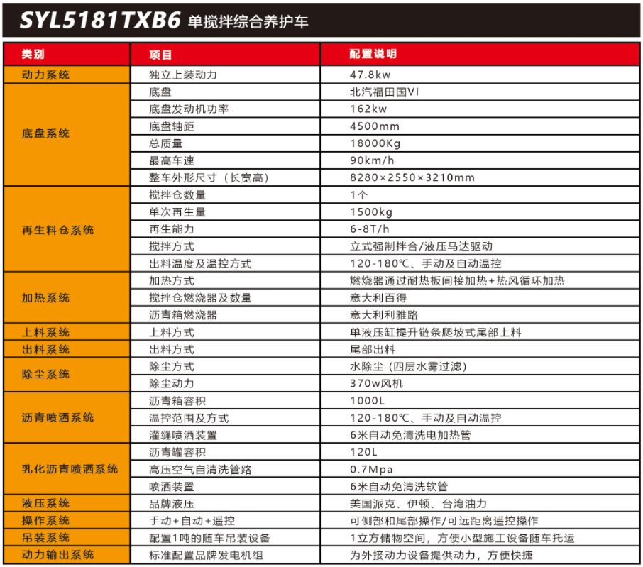 SYL5181TXB6 單攪拌綜合養(yǎng)護(hù)車是一款集現(xiàn)場生產(chǎn)新瀝青混合料、瀝青路面冷料、 舊料、銑刨料100%現(xiàn)場加熱再生利用 ,熱瀝青灑布、裂紋跟蹤灌縫、乳化瀝青噴灑、為其他裝置提供電力和液壓動(dòng)力等多種功能于一體的瀝青路面熱再生綜合養(yǎng)護(hù)車。可實(shí)現(xiàn)多場合、多路面的各種類養(yǎng)護(hù)作業(yè) ,養(yǎng)護(hù)修補(bǔ)費(fèi)用低 ,作業(yè)快捷 ,高效率、節(jié)能環(huán)保性能突出等特點(diǎn)。適用于遠(yuǎn)郊較寬闊區(qū)域中大施工量和高速公路的修補(bǔ)施工。